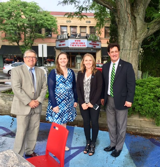 Top photo : Lansdowne Mayor Anthony Campuzano, Suburban Realtors® Alliance Government Affairs Manager Erin Smist, and Suburban West Realtors® Association Board Member Shannon Diiorio and Chairman Steve D’Antonio stand at the edge of the Lansdowne Landing, across the street from the historic Lansdowne Theatre.