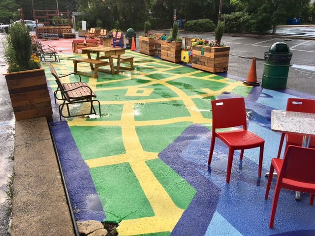 Inspired by popular outdoor gathering places like The Porch in Philadelphia’s University City neighborhood, Lansdowne Landing has already become a community hub since it opened in May. Fifteen parking spots were painted over with a colorful ground mural by local artist Brad Carney, filled with tables, chairs and toys, and lined with plants. The space has been used for farmers markets, live music performances, meditation classes and other activities and events.