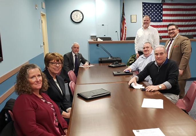 Pictured: A meeting to discuss Falls Township U&O issues in February 2020. From left: Maureen Scanlin (SRA board member), Pam Croke (BCAR AE and SRA board), Matt Takita (Falls Twp Manager), Jamie Ridge (SRA CEO/president), Bob Ramagli (Century 21) Drew Ferrara (RE/MAX Total), Alex Shnayder (SRA board president 2019-2020). Photographer/not pictured: Connie Kaminski (RE/MAX Total)