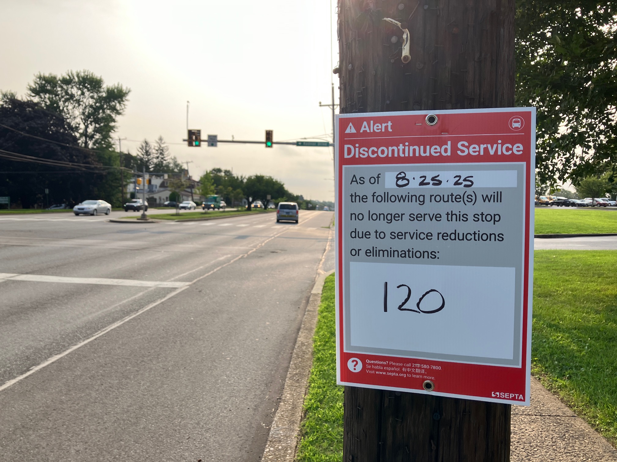 A SEPTA notice posted at a bus stop on West Chester Pike in Newtown Square alerts transit riders that Bus 120 will be discontinued in August. SEPTA needs new state funding by Aug. 14 to prevent the first round of service cuts.